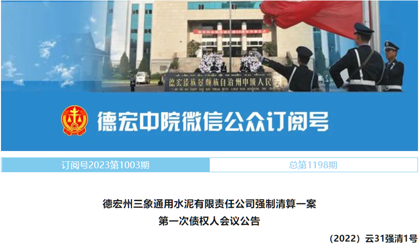 6月19日,德宏中院發(fā)布《德宏州三象通用水泥有限責(zé)任公司強制清算一案第一次債權(quán)人會議公告》稱,定于2023年6月28日上午9時30分以網(wǎng)絡(luò)會議形式召開德宏州三象通用水泥有限責(zé)任公司第一次債權(quán)人會議。