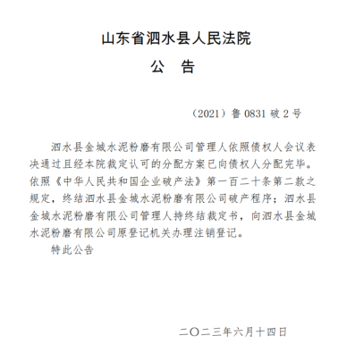 6月14日山東省泗水縣人民法院發(fā)布公告稱,泗水縣金城水泥粉磨有限公司管理人依照債權(quán)人會議表決通過且經(jīng)本院裁定認可的分配方案已向債權(quán)人分配完畢。依照《中華人民共和國企業(yè)破產(chǎn)法》相關(guān)規(guī)定,終結(jié)泗水縣金城水泥粉磨有限公司破產(chǎn)程序;泗水縣金城水泥粉磨有限公司管理人持終結(jié)裁定書,向泗水縣金城水泥粉磨有限公司原登記機關(guān)辦理注銷登記。