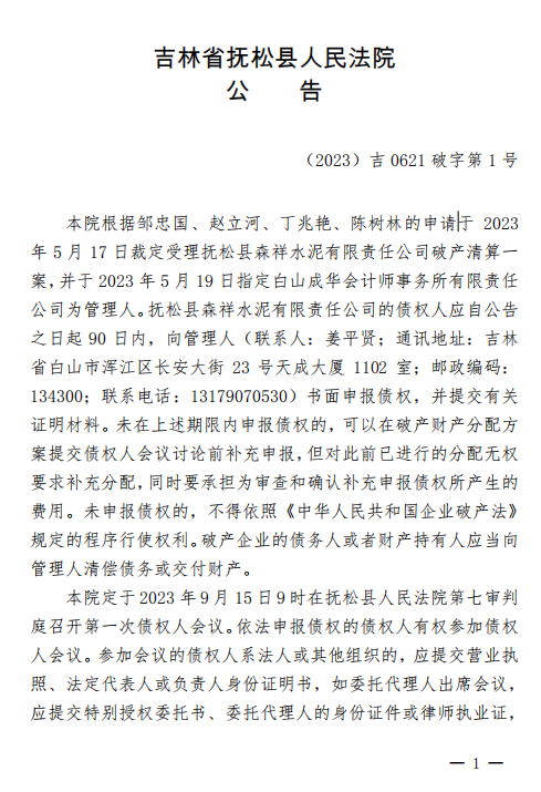 吉林省撫松縣人民法院公告于2023年5月17日裁定受理撫松縣森祥水泥有限責(zé)任公司破產(chǎn)清算一案,并于2023年5月19日指定白山成華會計師事務(wù)所有限責(zé)任公司為管理人。