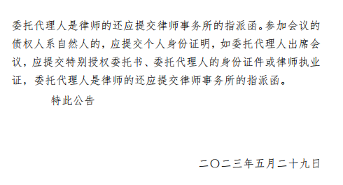 參加會議的債權(quán)人是法人或其他組織的,應(yīng)當(dāng)提供營業(yè)執(zhí)照、法定代表人或負責(zé)人身份證明書,如委托代理人參加的,還應(yīng)當(dāng)提供特別授權(quán)委托書、委托人身份證或律師執(zhí)業(yè)證,委托代理人是律師的還應(yīng)提交律師事務(wù)所的指派函,并于2023年6月28日上午9點20分登錄破易云平臺(方式一:手機微信搜索“破易云”小程序,在登錄頁中輸入手機號、獲取短信驗證碼并輸入案件識別碼:111481,登錄參會;方式二:電腦瀏覽器訪問網(wǎng)址https://zqr.poyiyun.com/ 登錄后參與會議,本案件識別碼:111481)召開德宏州三象通用水泥有限責(zé)任公司強制清算案第一次債權(quán)人正式會議,本次會議開始前管理人將會議文本上傳至破易云平臺,請債權(quán)人及時登陸破易云平臺下載查閱。請各位債權(quán)人準(zhǔn)時登錄系統(tǒng),點擊進入債權(quán)人會議,通過網(wǎng)絡(luò)方式參與會議和投票表決。
