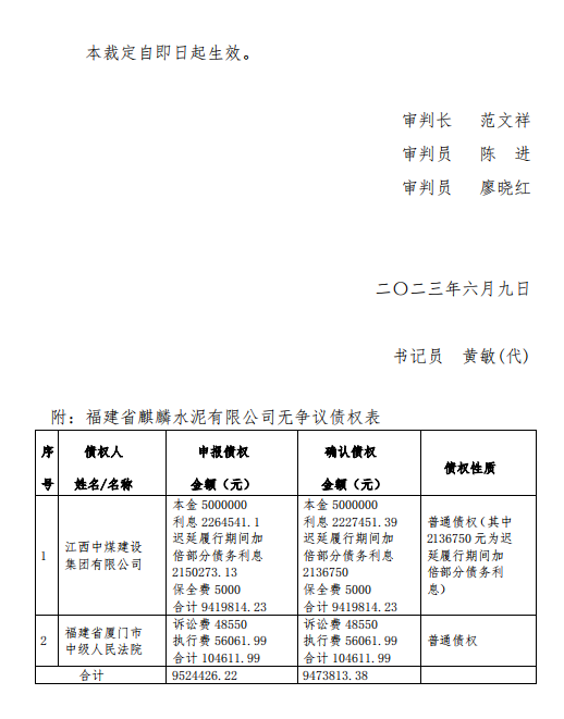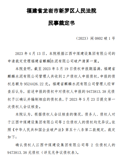 2023年4月13日,福建省龍巖市新羅區(qū)人民法院根據(jù)江西中煤建設(shè)集團有限公司的申請裁定受理福建省麒麟水泥有限公司破產(chǎn)清算一案。法院查明,截至2023年5月19日債權(quán)申報期屆滿,福建省麒麟水泥有限公司管理人共收到2戶債權(quán)人申報債權(quán),申報的債權(quán)總額為9524426.22元。