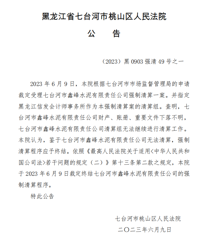 2023年6月9日,黑龍江省七臺河市桃山區(qū)人民法院根據(jù)七臺河市市場監(jiān)督管理局的申請裁定受理七臺河市鑫峰水泥有限責(zé)任公司強制清算一案。并指定黑龍江信發(fā)會計師事務(wù)所作為本強制清算案的清算組。