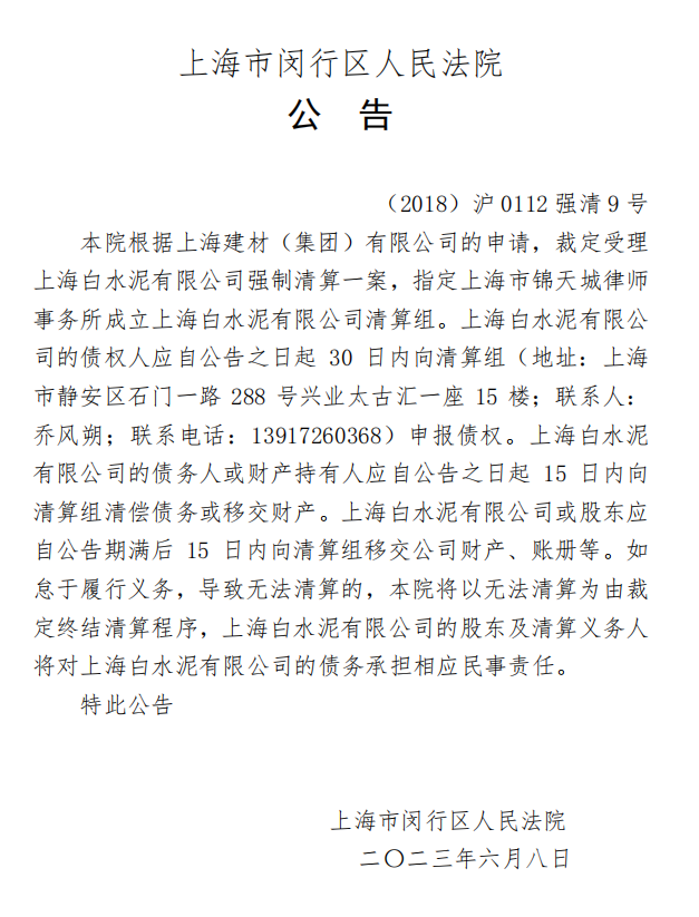 上海市閔行區(qū)人民法院公告,根據(jù)上海建材(集團)有限公司的申請,裁定受理上海白水泥有限公司強制清算一案,指定上海市錦天城律師事務(wù)所成立上海白水泥有限公司清算組。