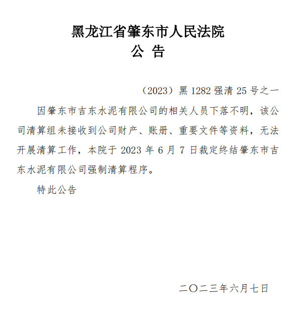 因肇東市吉東水泥有限公司的相關(guān)人員下落不明,清算組未接收到公司財產(chǎn)、賬冊、重要文件等資料,無法開展清算工作,黑龍江省肇東市人民法院于2023年6月7日裁定終結(jié)肇東市吉東水泥有限公司強制清算程序。