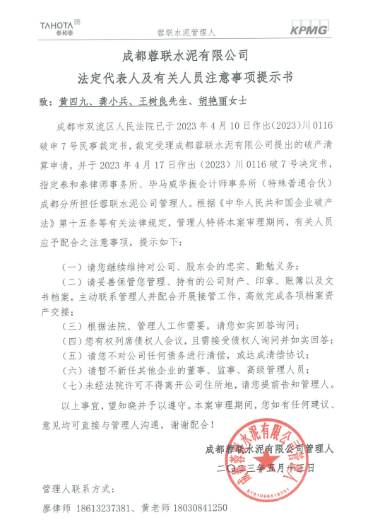 成都市雙流區(qū)人民法院于2023年4月10日裁定受理成都蓉聯(lián)水泥有限公司提出的破產(chǎn)清算申請,并于2023年4月17日指定泰和泰律師事務(wù)所、畢馬威華振會計師事務(wù)所特殊普通合伙成都分所擔(dān)任蓉聯(lián)水泥公司管理人。