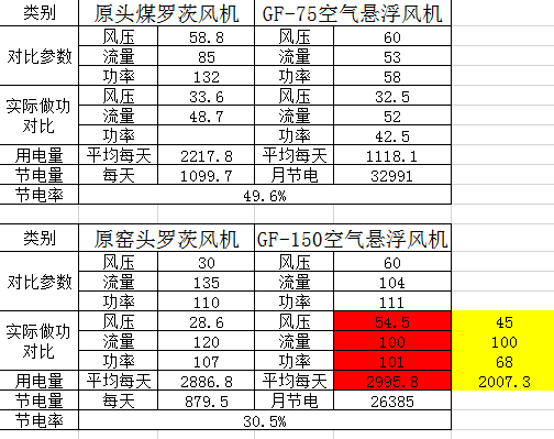 贊皇金隅水泥有限公司對廠中二線頭煤羅茨風機、窯頭一次風機進行了節(jié)能改造,頭煤風機換為:GF75-0.6型空氣懸浮風機;窯頭一次風機換為:GF150-0.6型空氣懸浮風機,兩種風機參數做功及用電量對比如下表所示:
