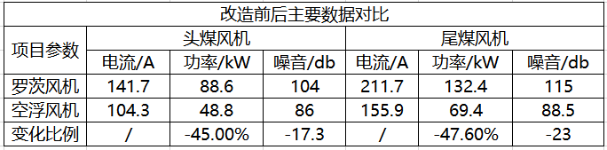 1、頭煤空氣懸浮風機:根據實際參數對比后累計正常運行41天的用電量,對比后空氣懸浮風機節(jié)電率為49.6%,達到合同簽訂要求。