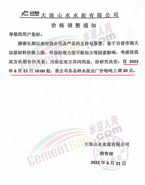 水泥人網(wǎng)通訊員消息:日前大連山水水泥有限公司通知,從2023年6月25日18點開始把系統(tǒng)寄存PO42.5散裝水泥價格調(diào)整到260元/噸。據(jù)了解,這是企業(yè)6月21日發(fā)函通知上調(diào)報價20元/噸的第二次調(diào)價,五日內(nèi)連續(xù)兩次逆勢調(diào)價,累計上調(diào)40元/噸。