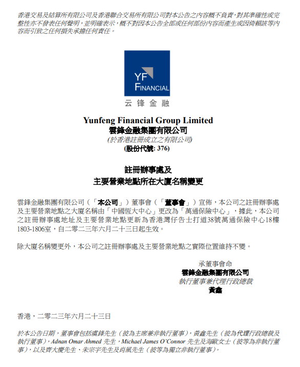 6月23日,云鋒金融集團(tuán)發(fā)布公告,公司之注冊(cè)辦事處及主要營(yíng)業(yè)地點(diǎn)之大廈名稱由“中國(guó)恒大中心”更改為“萬(wàn)通保險(xiǎn)中心”。據(jù)此,公司之注冊(cè)辦事處地址及主要營(yíng)業(yè)地點(diǎn)更新為香港灣仔告士打道38號(hào)萬(wàn)通保險(xiǎn)中心18樓1803-1806室,自2023年6月23日起生效。