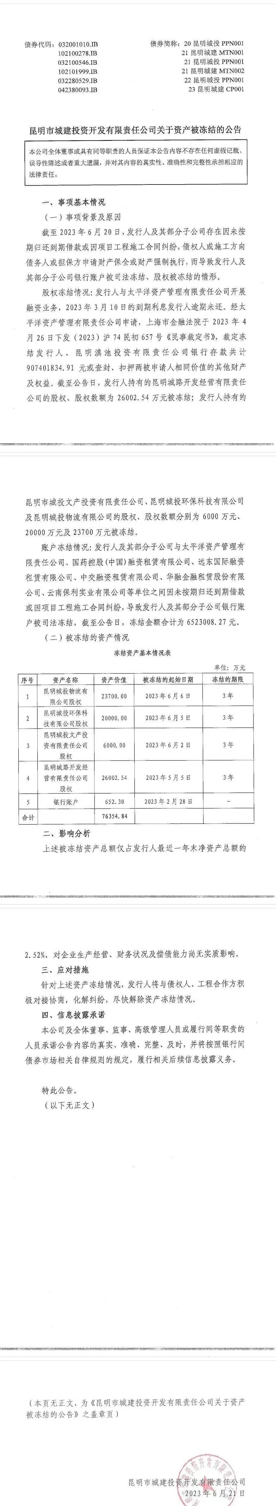 6月21日,昆明市城建投資開(kāi)發(fā)有限責(zé)任公司發(fā)布公告,截至2023年6月20日,發(fā)行人及其部分子公司存在因未按期歸還到期借款或因項(xiàng)目工程施工合同糾紛,債權(quán)人或施工方向債務(wù)人或擔(dān)保方申請(qǐng)財(cái)產(chǎn)保全或財(cái)產(chǎn)強(qiáng)制執(zhí)行,而導(dǎo)致發(fā)行人及其部分子公司銀行賬戶被司法凍結(jié)、股權(quán)被凍結(jié)合計(jì)7.64億。