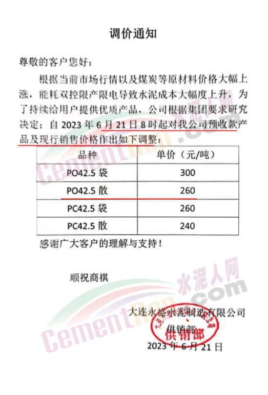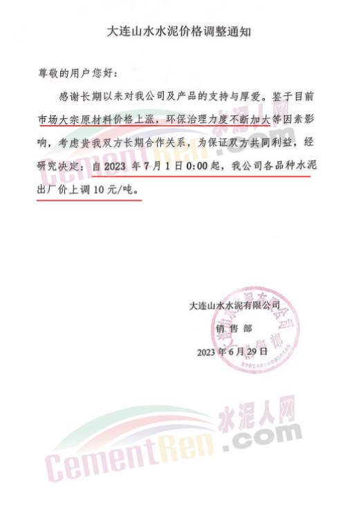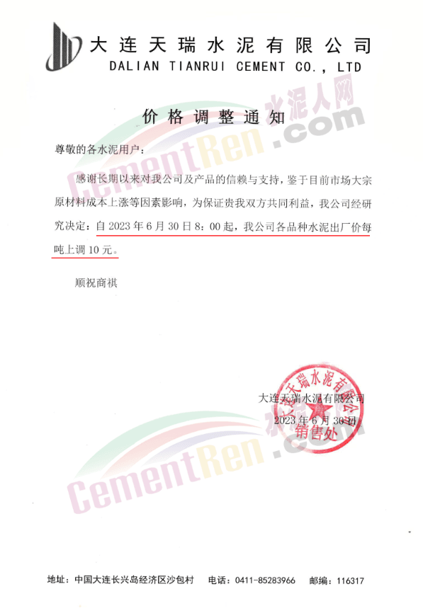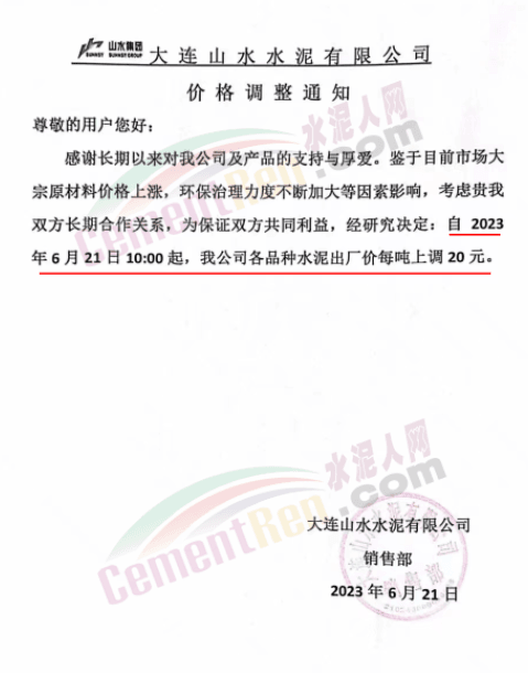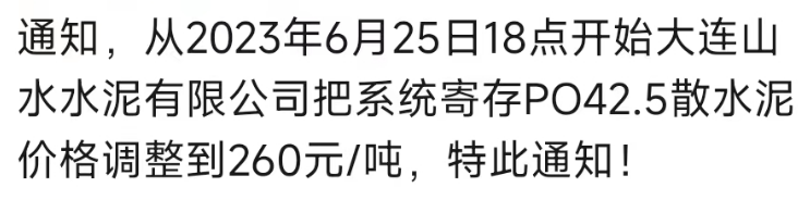 同期,大連天瑞水泥有限公司通知,鑒于目前市場大宗原材料成本上漲等因素影響,公司經(jīng)研究決定,自2023年6月30日8:00起,公司各品種水泥出廠價上調(diào)10元/噸。