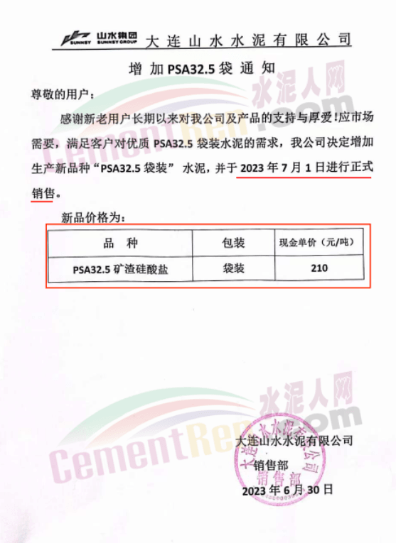 大連山水水泥有限公司6月30日發(fā)布的通知,還包括于今日(2023年7月1日是)起推出低標號P.S.A32.5礦渣硅酸鹽袋裝水泥,新品報價210元/噸。