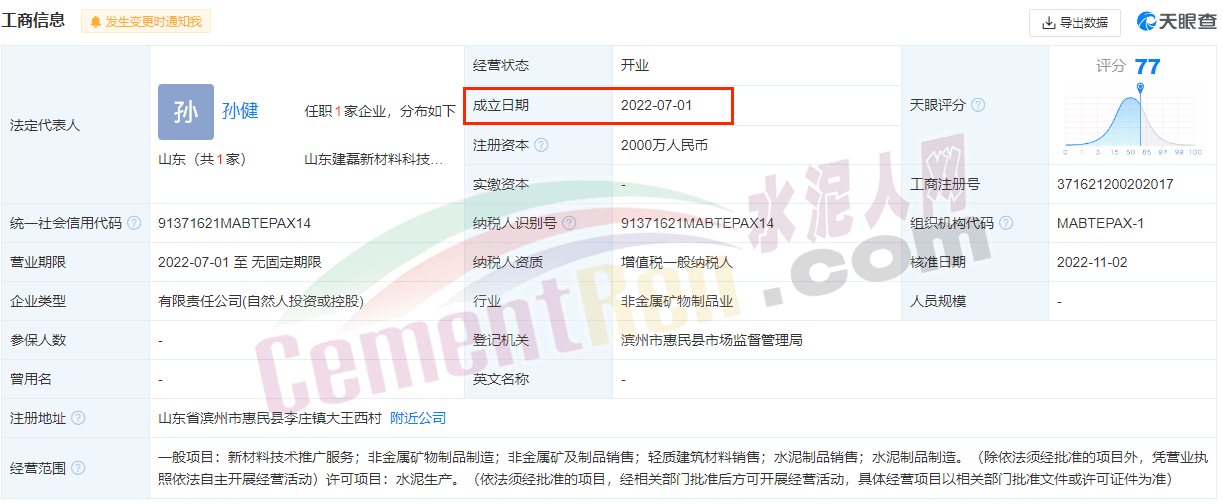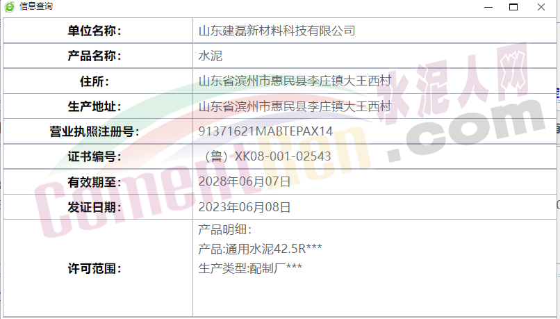據(jù)查詢山東建磊新材料科技有限公司于2022年7月1日成立,截至7月1日剛好成立一年。企業(yè)注冊信息顯示,經(jīng)營范圍為新材料技術推廣服務;非金屬礦物制品制造;非金屬礦及制品銷售;輕質(zhì)建筑材料銷售;水泥制品銷售;水泥制品制造,許可項目為水泥生產(chǎn)。