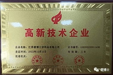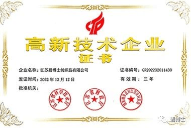 近日,江蘇碧博士紡織品有限公司(以下簡稱“碧博士”)成功獲得國家“高新技術(shù)企業(yè)”認定殊榮,正式邁入國家高新技術(shù)企業(yè)行列。本次成功入選高新技術(shù)企業(yè),是國家相關部門對碧博士多年來工作的肯定,也是碧博士產(chǎn)品研發(fā)實力與創(chuàng)新能力的體現(xiàn)。