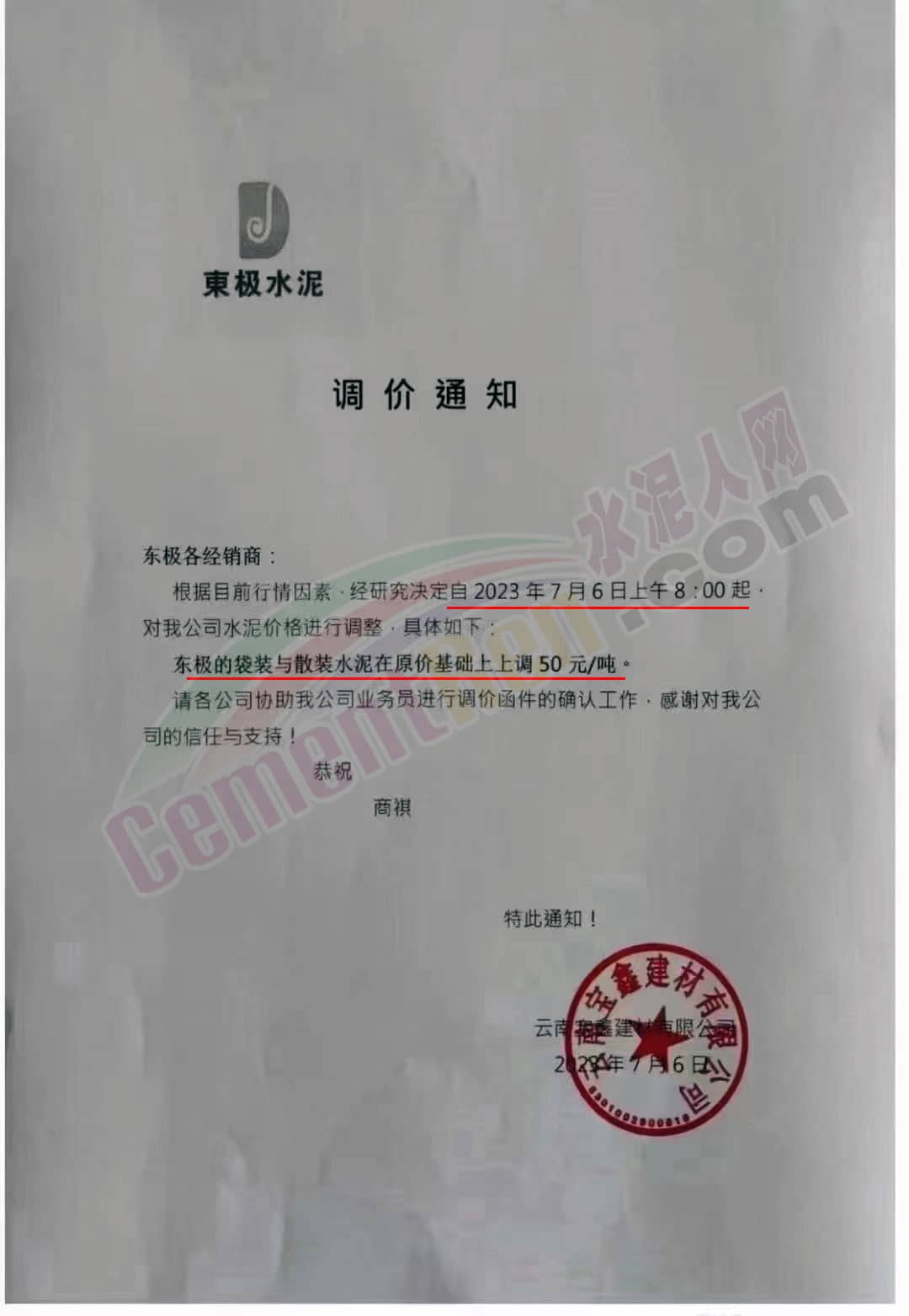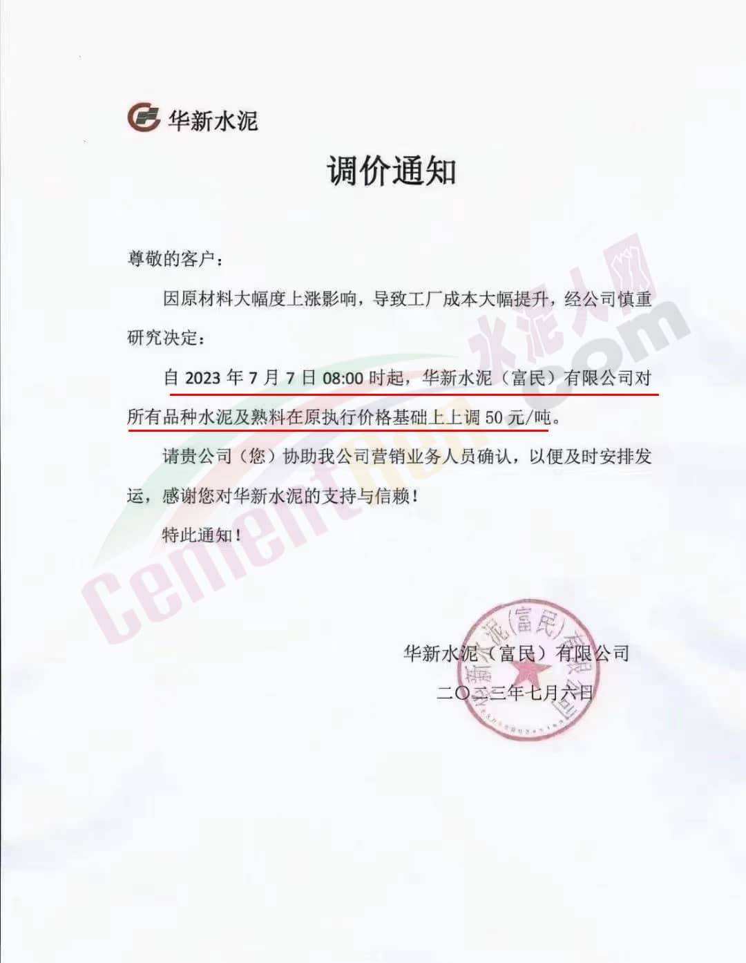 華新水泥(富民)有限公司通知,因原材料大幅度上漲影響,導(dǎo)致工廠成本大幅提升,經(jīng)公司慎重研究決定:自2023年7月7日8時(shí)起,華新水泥(富民)有限公司對(duì)所有品種水泥及熟料在原執(zhí)行價(jià)格基礎(chǔ)上上調(diào)50元/噸。