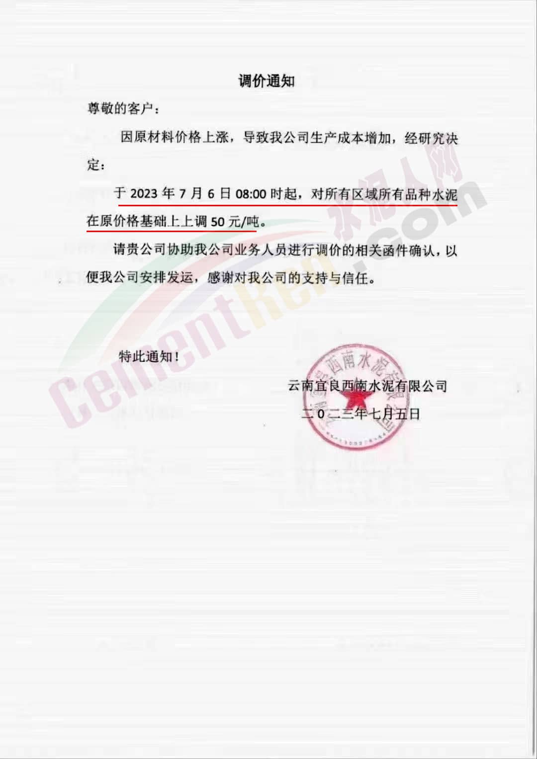 云南宜良西南水泥有限公司通知,因原材料價(jià)格上漲,導(dǎo)致公司生產(chǎn)成本增加,經(jīng)研究決定:于2023年7月6日8時(shí)起,對(duì)所有區(qū)域所有品種水泥在原價(jià)格基礎(chǔ)上上調(diào)50元/噸。