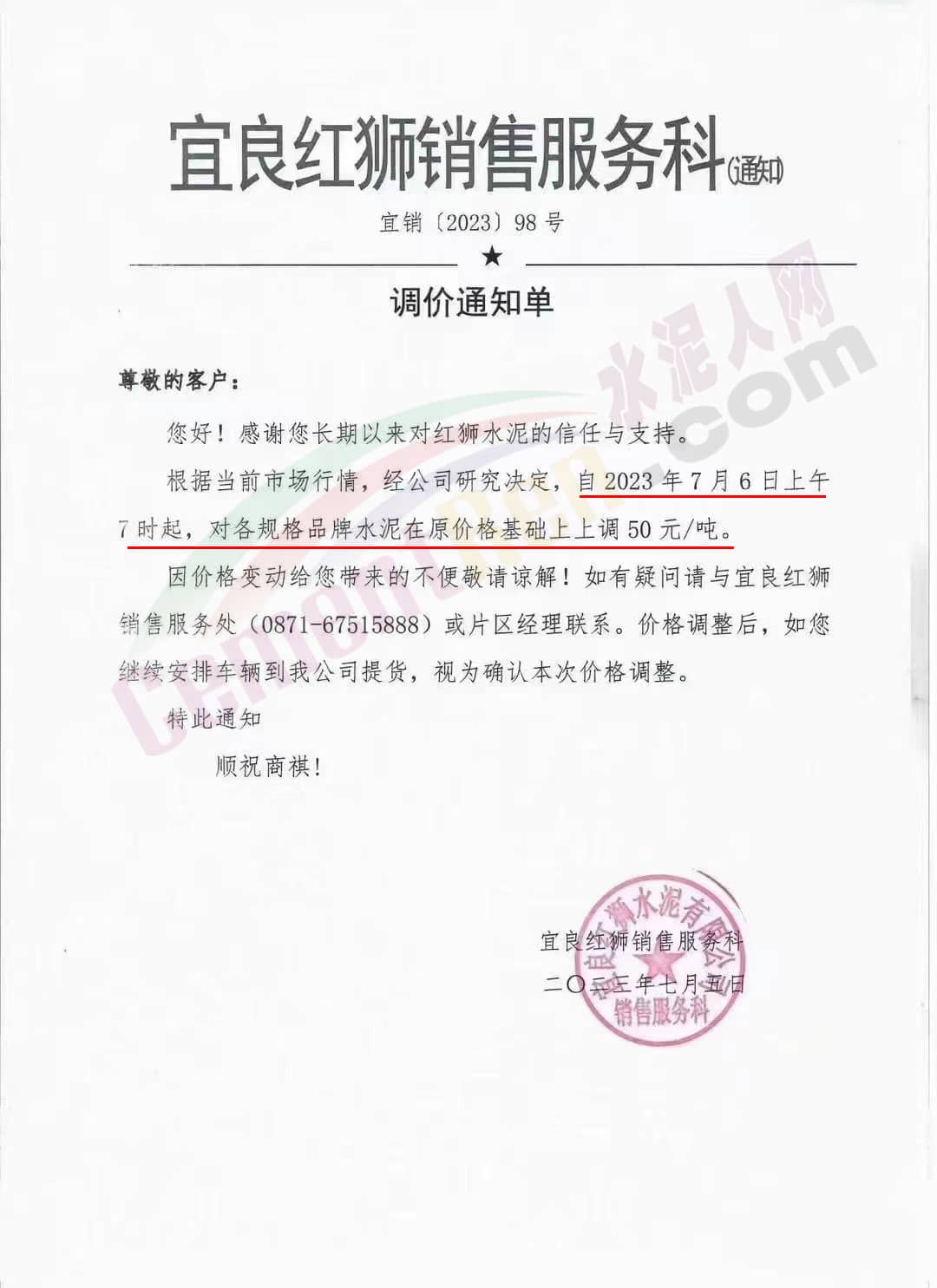 宜良紅獅銷(xiāo)售服務(wù)科通知,根據(jù)當(dāng)前市場(chǎng)行情,經(jīng)公司研究決定,自2023年7月6日上午7時(shí)起,對(duì)各規(guī)格品牌水泥在原價(jià)格基礎(chǔ)上上調(diào)50元/噸。