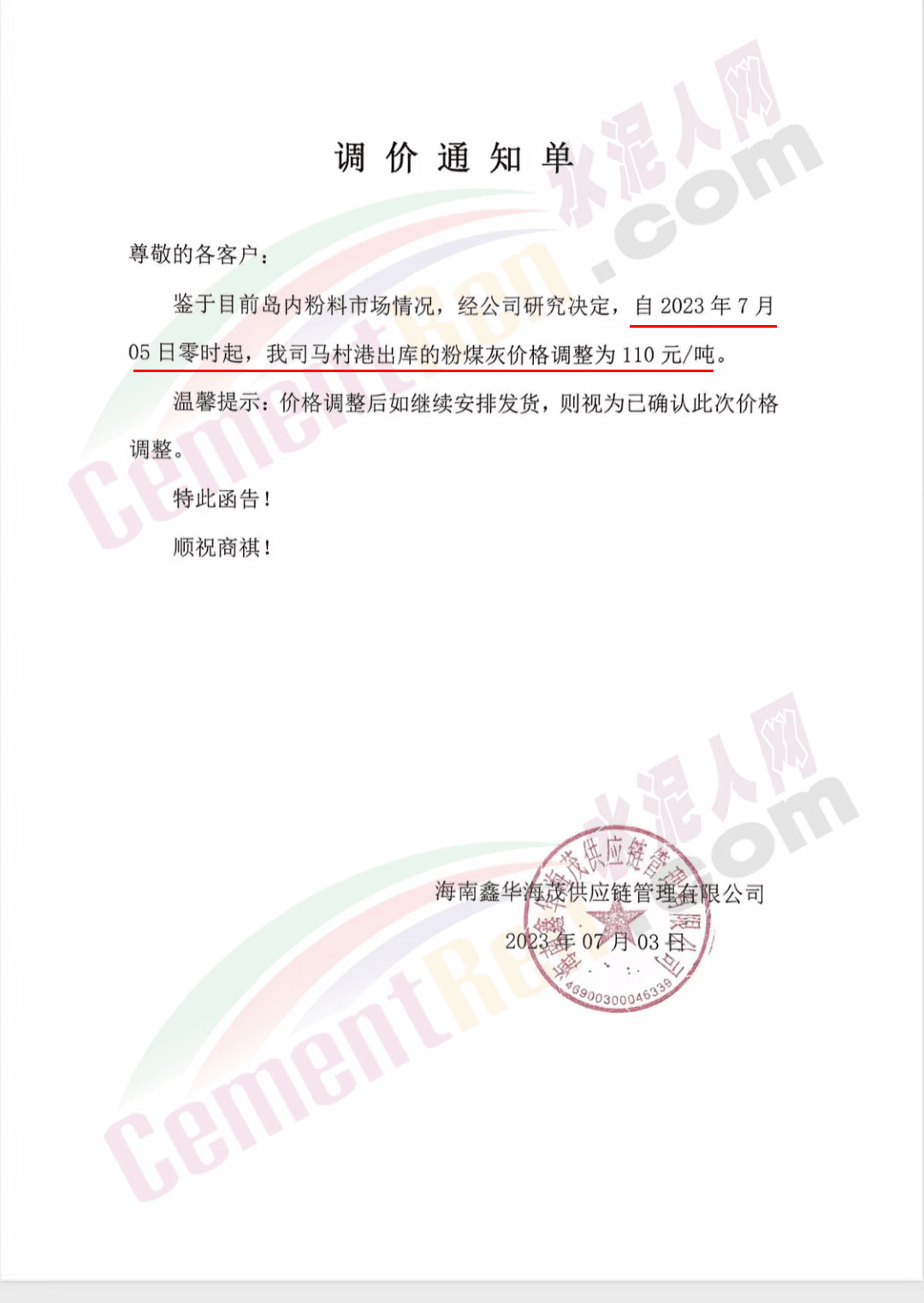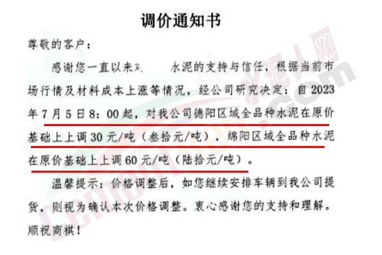 “天涯‘牌水泥通知,自2023年7月8日零時(shí)起所有品種水泥在出廠價(jià)格基礎(chǔ)上上調(diào)30元/噸,同期調(diào)整粉煤灰及礦渣粉報(bào)價(jià)。