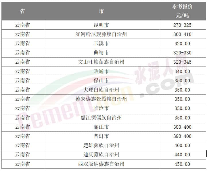 據(jù)水泥人網(wǎng)了解,或因云南省內(nèi)各區(qū)域錯(cuò)峰生產(chǎn)執(zhí)行力度不同,各區(qū)域水泥差價(jià)較大,低價(jià)水泥對多地市場都有沖擊。水泥人網(wǎng)信息中心監(jiān)控?cái)?shù)據(jù)顯示,目前云南省內(nèi)參考報(bào)價(jià)在270-450元/噸,昆明區(qū)域P.O42.5散裝水泥報(bào)價(jià)在270-325元/噸不等,不同企業(yè)最大差價(jià)在55元/噸左右。
