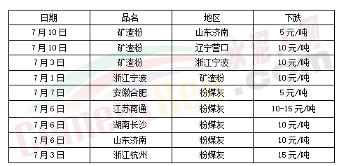 同期山東、江蘇、安徽、浙江、湖南多地礦渣粉及粉煤灰也處于下跌行情。
