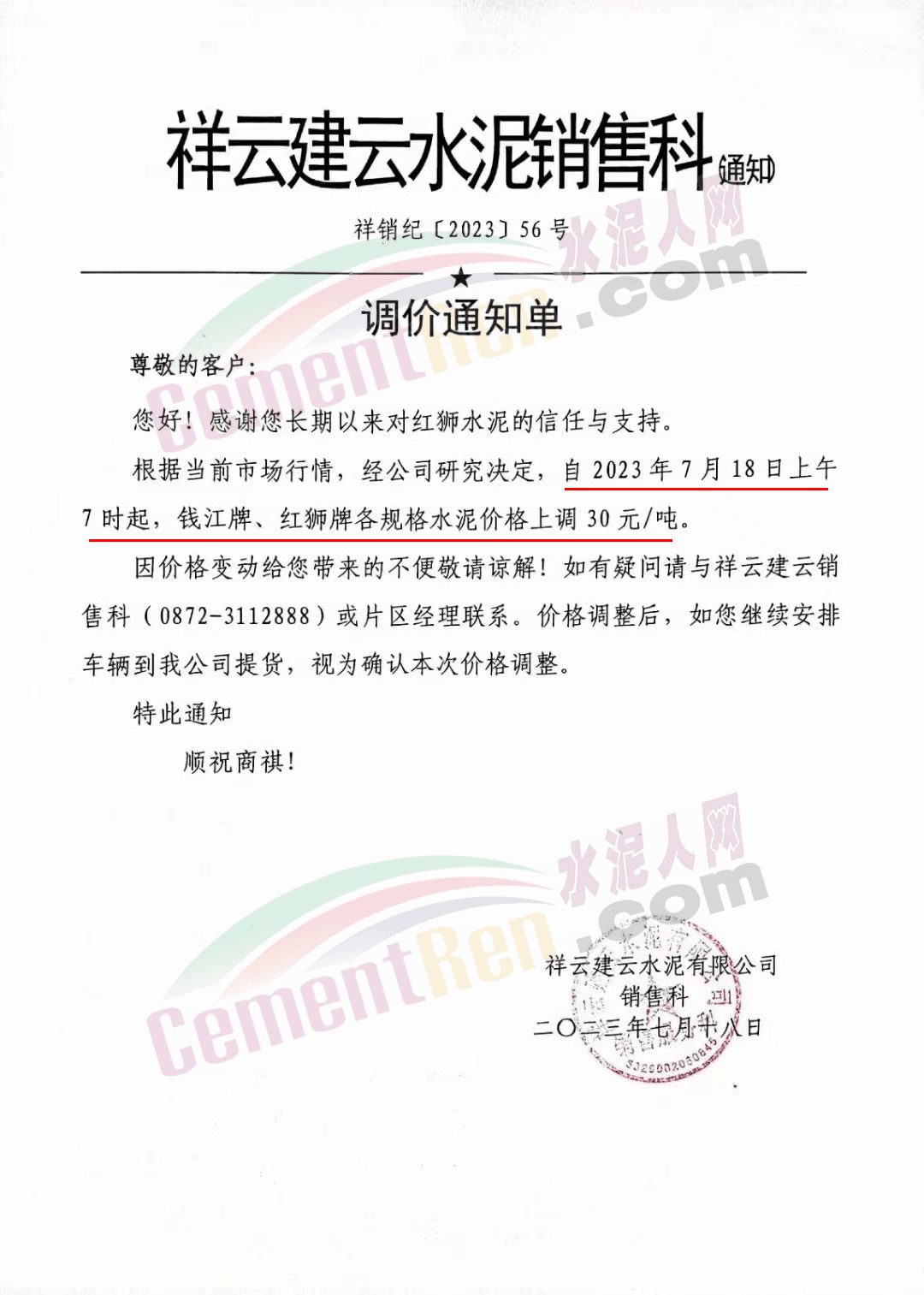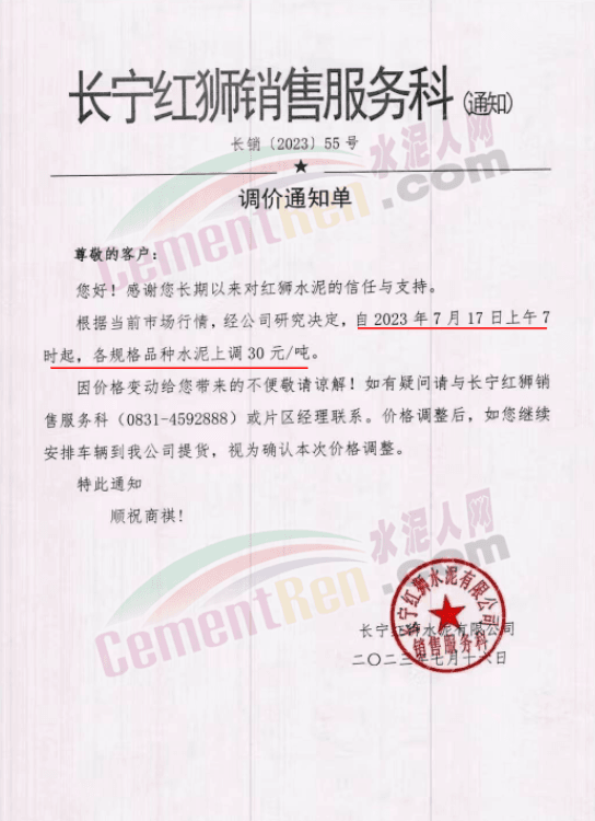 祥云建云水泥銷售科通知根據(jù)當(dāng)前市場行情,經(jīng)公司研究決定,自2023年7月18日上午7時起,錢江牌、紅獅牌各規(guī)格水泥價格上調(diào)30元/噸。