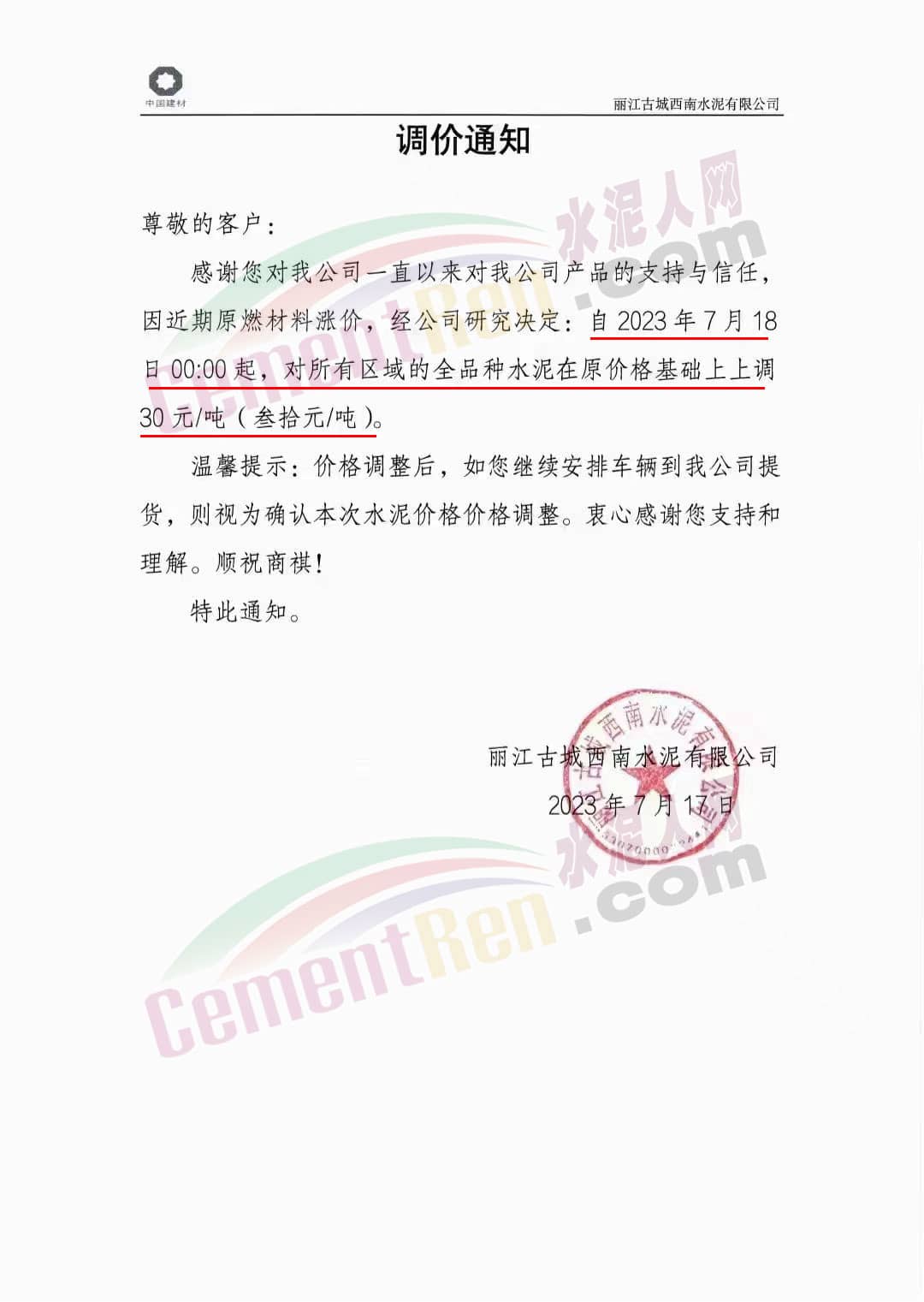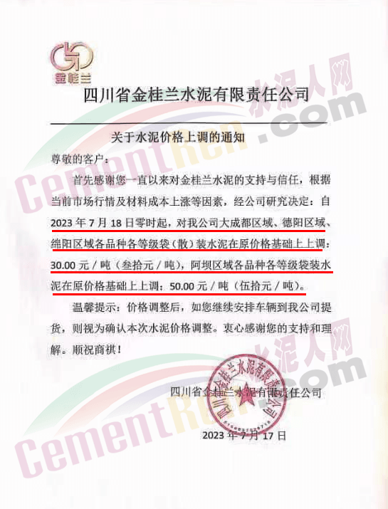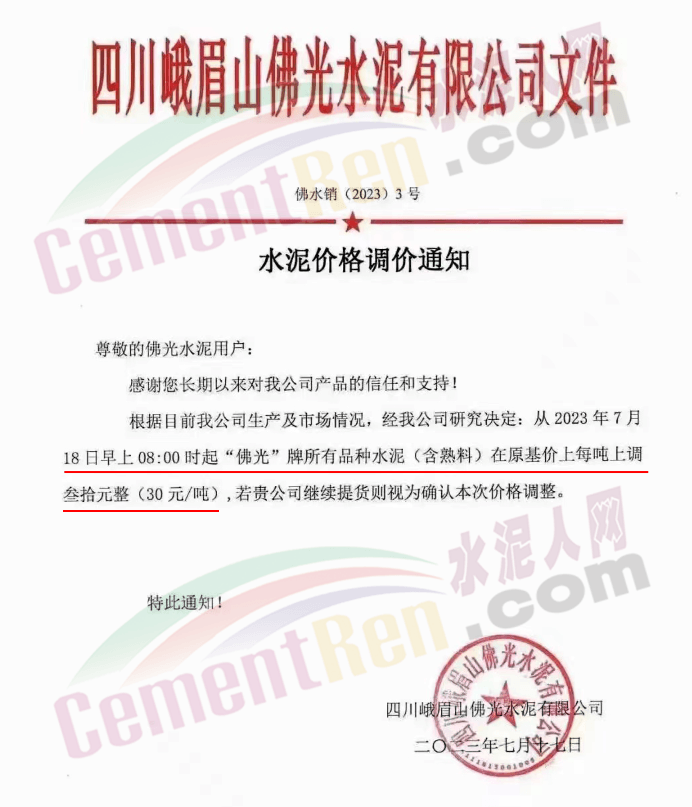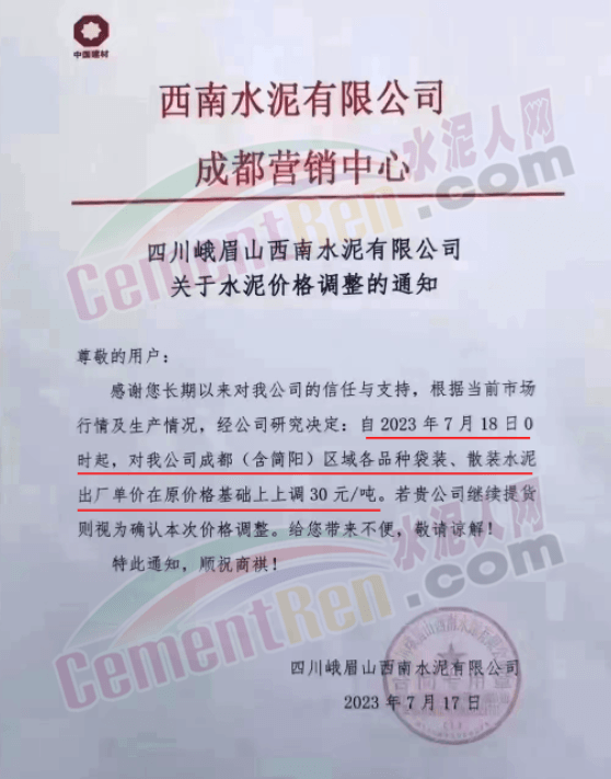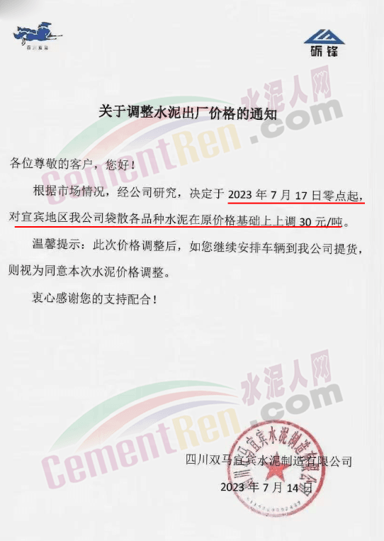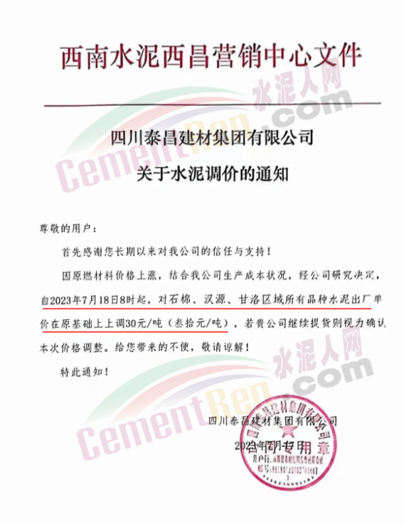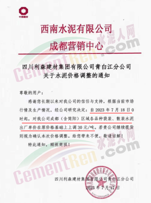 麗江古城西南水泥有限公司通知,因近期原燃材料漲價,經(jīng)公司研究決定,自2023年7月18日0時起,對所有區(qū)域的全品種水泥在原價格基礎(chǔ)上上調(diào)30元/噸。