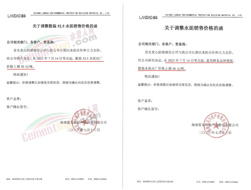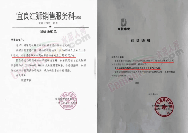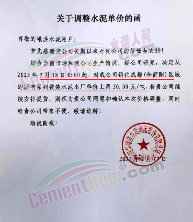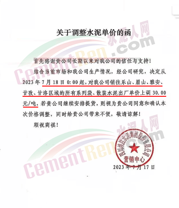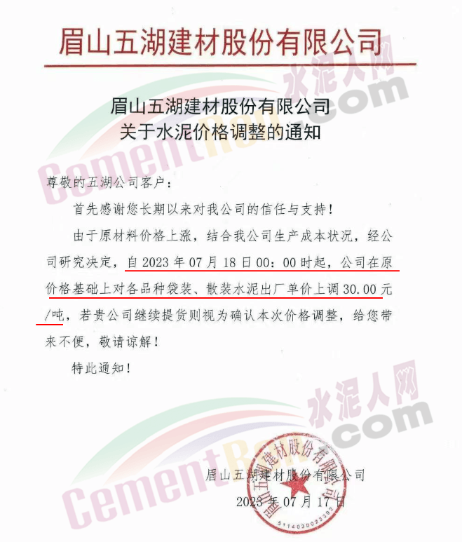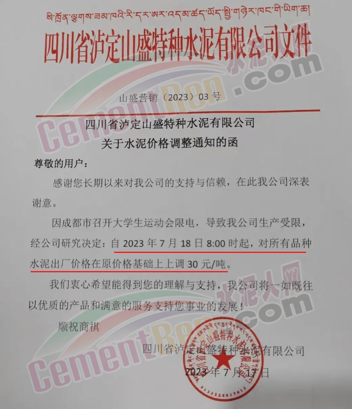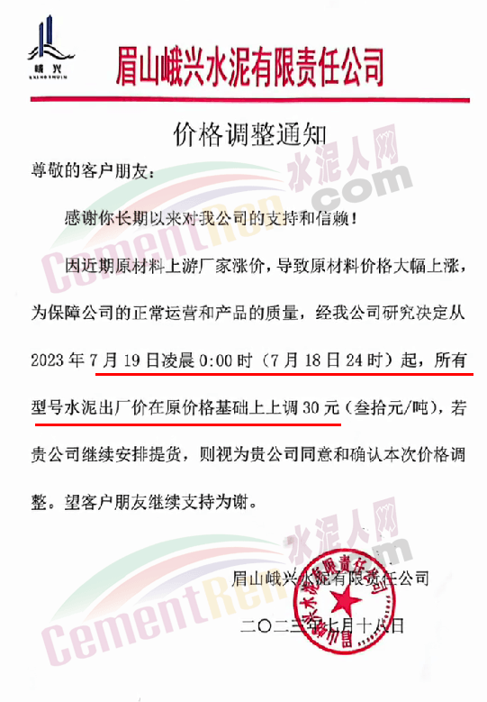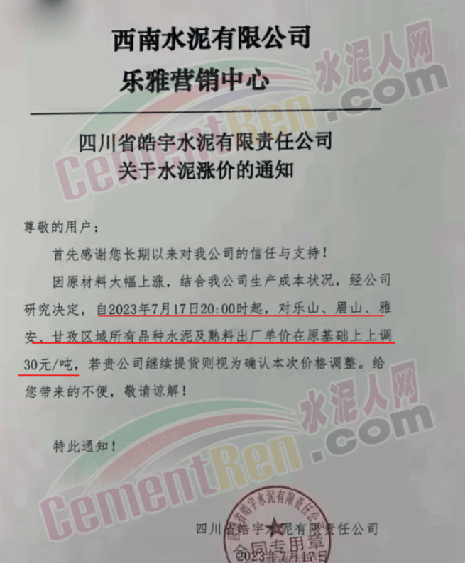 麗江古城西南水泥有限公司通知,因近期原燃材料漲價,經(jīng)公司研究決定,自2023年7月18日0時起,對所有區(qū)域的全品種水泥在原價格基礎(chǔ)上上調(diào)30元/噸。