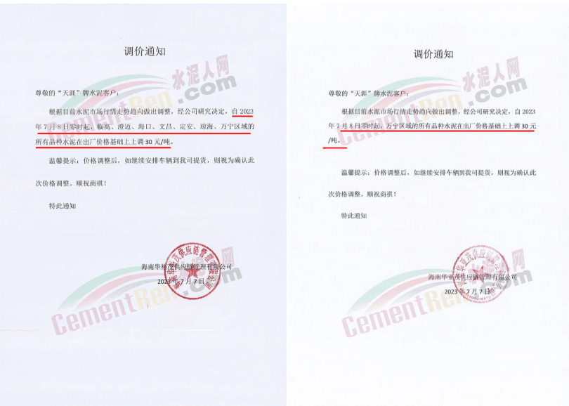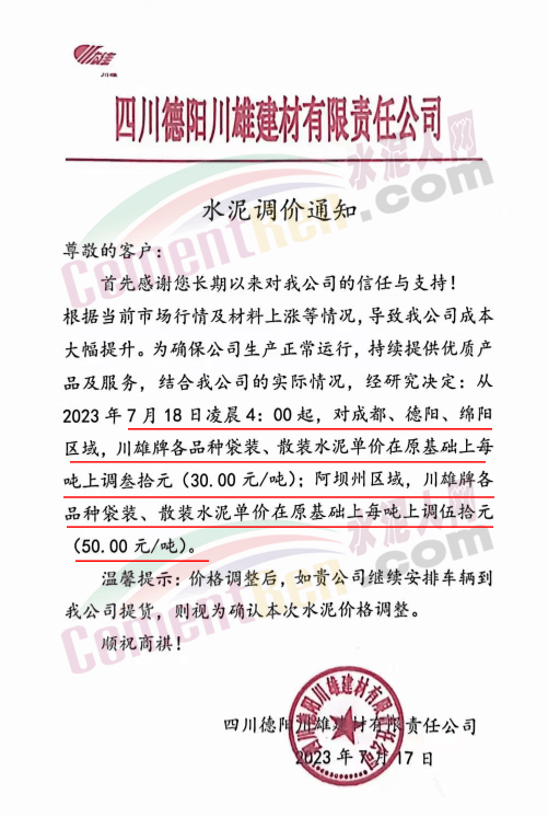 迪慶香格里拉昆鋼鴻達水泥有限公司通知鑒于目前原燃材料價格上漲因素影響,為保障正常市場供應(yīng),經(jīng)公司研究決定作出以下價格調(diào)整,對銷售迪慶區(qū)域全品種水泥在原出廠單價基礎(chǔ)上統(tǒng)一上調(diào)30元/噸,執(zhí)行時間2023年7月18日0時。