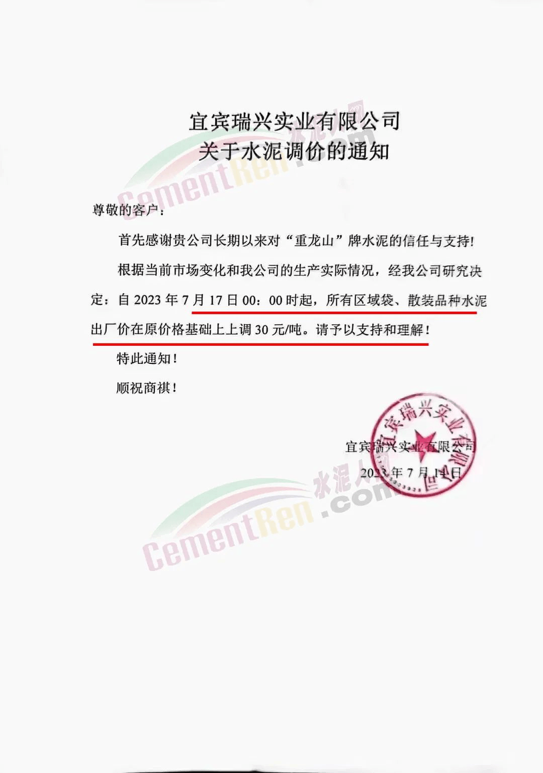 華潤水泥華西大區(qū)市場部通知受原材料價格上漲影響,為保障持續(xù)為客戶提供優(yōu)質(zhì)的產(chǎn)品和服務(wù),經(jīng)公司研究決定,自2023年7月18日0時起,從華潤水泥(鶴慶)有限公司出貨至麗江、大理地區(qū)市場的所有品種水泥出廠價上調(diào)30元/噸。