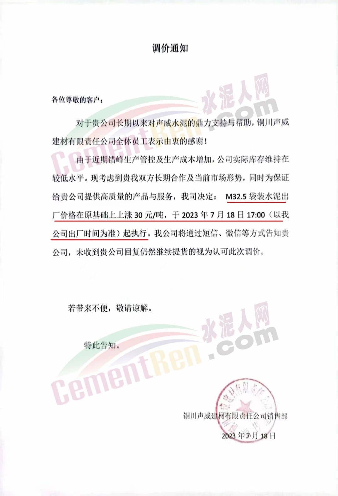 銅川聲威建材有限責(zé)任公司通知稱,由于近期錯峰生產(chǎn)管控及生產(chǎn)成本增加,公司實際庫存維持在較低水平。公司決定M32.5袋裝水泥出廠價格在原基礎(chǔ)上上漲30元/噸,于2023年7月18日17時起執(zhí)行。