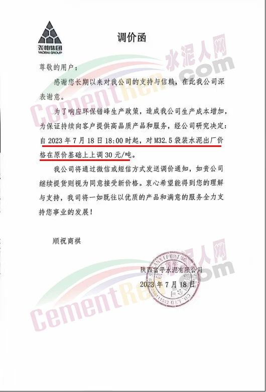 蒲城堯柏特種水泥有限公司通知,為了響應(yīng)環(huán)保錯峰生產(chǎn)政策,造成公司生產(chǎn)成本增加。為保證持續(xù)向客戶提供高品質(zhì)產(chǎn)品和服務(wù),經(jīng)公司研究決定,自2023年7月18日18時起,對M32.5袋裝水泥出廠價格在原價基礎(chǔ)上上調(diào)30元/噸。