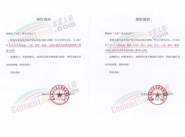 華新水泥(劍川)有限公司通知結(jié)合市場情況,經(jīng)公司研究決定,特此通知價格調(diào)整。自2023年7月19日8時起,所有水泥品種統(tǒng)一上調(diào)30元/噸。