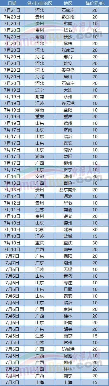 另?yè)?jù)了解,在管理費(fèi)用,技改支出增加,但市場(chǎng)價(jià)格卻跌跌不休的情況下,有部分企業(yè)已在虧本銷售。盡管如此,市場(chǎng)降價(jià)信息仍不斷涌來(lái)。7月份以來(lái)河北、河南、山東、廣東、廣西、江蘇、安徽、湖南、遼寧、重慶、貴州等10多個(gè)區(qū)域水泥價(jià)格仍處于下行態(tài)勢(shì)。