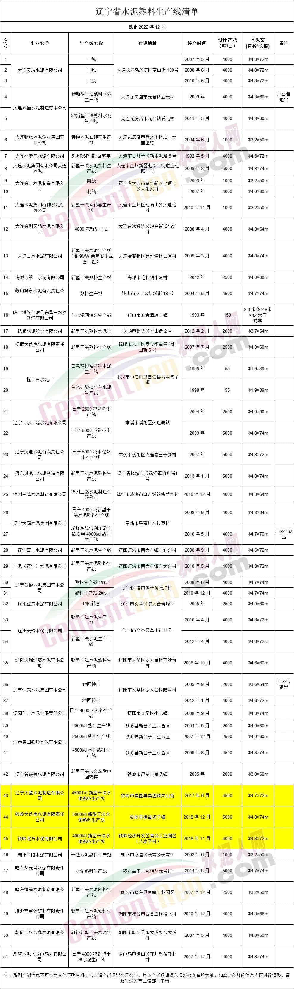 遼寧省工信廳水泥熟料生產(chǎn)線清單中顯示,截至2022年12月,遼寧省共有包括天瑞集團(tuán)、山水集團(tuán)、遼寧大鷹水泥集團(tuán)、亞泰集團(tuán)等39家水泥企業(yè)51條生產(chǎn)線,總產(chǎn)能為5122.8萬(wàn)噸,2015年以后新建產(chǎn)能占總產(chǎn)能的7.9%。