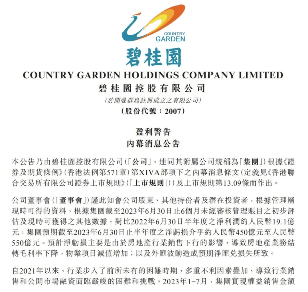 8月10日,處于輿論風(fēng)口浪尖的碧桂園以公告的方式正面回應(yīng)市場關(guān)切,坦承“公司遇到了自成立以來最大的困難”,公告中表示,預(yù)期截至2023年6月30日止半年度之凈虧損介乎約人民幣(下同)450億元-550億元。