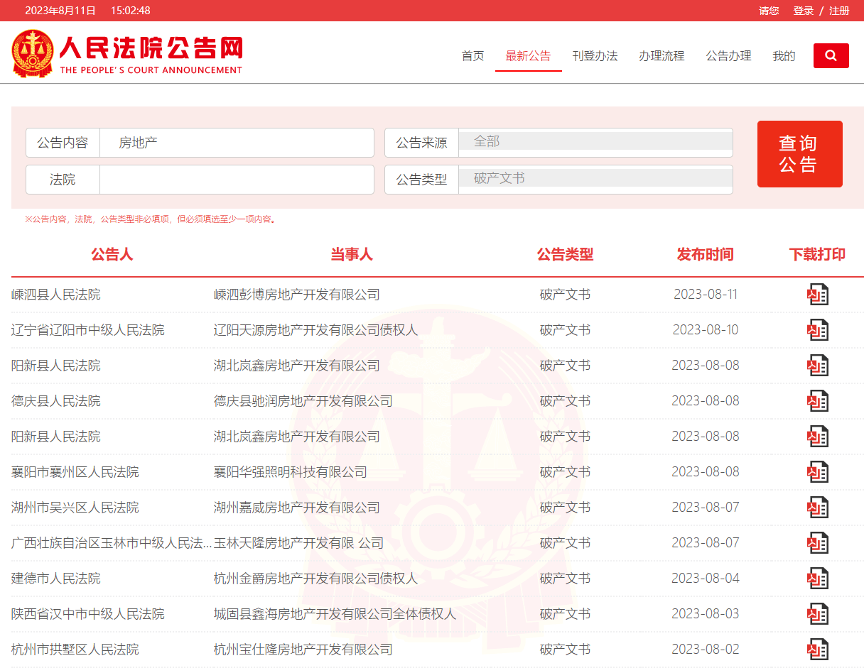 據(jù)人民法院公告網(wǎng)數(shù)據(jù),2023年以來截至發(fā)稿,已有175家房地產(chǎn)相關(guān)企業(yè)發(fā)布了破產(chǎn)公告。有的因為無法清償?shù)狡趥鶆?wù),有的負債過高,有的資金鏈斷裂,最終紛紛申請破產(chǎn)清算,名下房產(chǎn)、土地慘遭處理。
