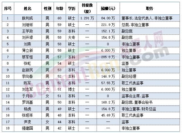 祁連山董事長(zhǎng)脫利成今年60歲,總裁劉繼彬、副總裁王學(xué)政今年59歲,副總裁劉開祿今年58歲。