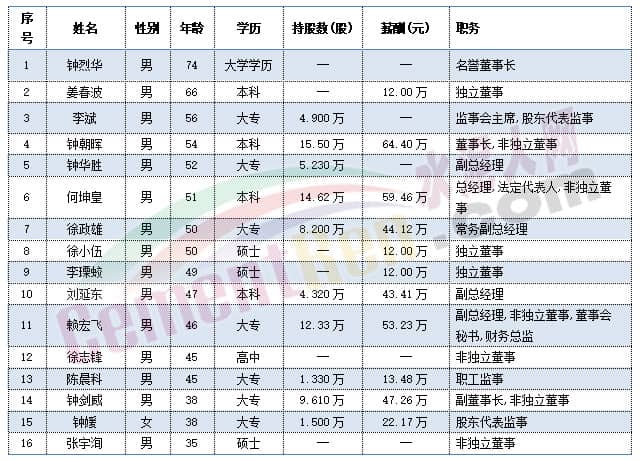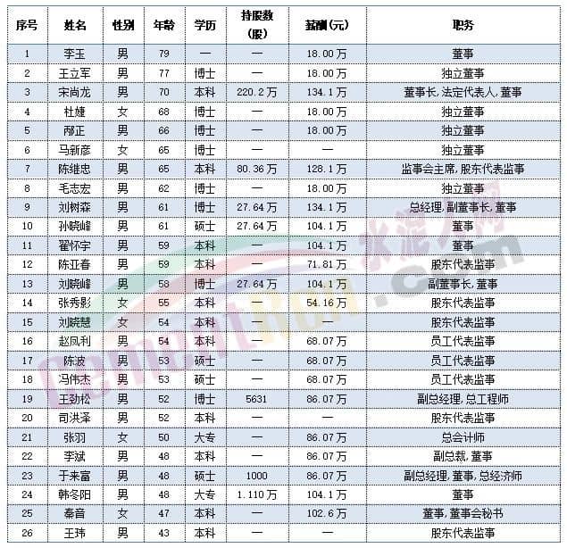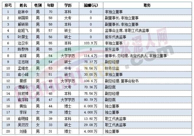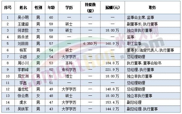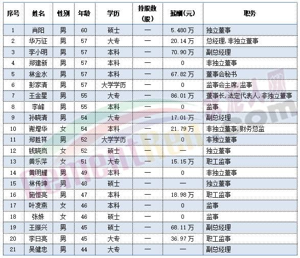 福建水泥獨(dú)立董事肖陽(yáng)今年60歲,總經(jīng)理華萬(wàn)征,副總經(jīng)理李小明,董事會(huì)秘書林金水以及監(jiān)事會(huì)主席彭家清今年都是57歲。