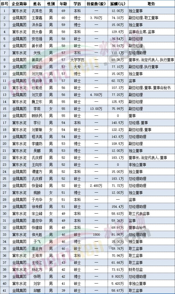 祁連山水泥總裁劉繼彬、海螺水泥副董事長(zhǎng)王建超;華新水泥總裁李葉青;尖峰集團(tuán)董事長(zhǎng)蔣曉萌、西部水泥總工程師王建禮;亞泰集團(tuán)董事翟懷宇在內(nèi)的18位上市公司高管為1964年生人,今年59歲。