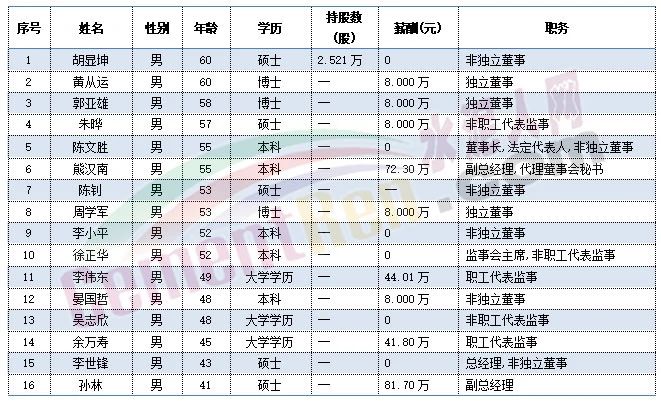 尖峰集團(tuán)職工代表秦旭平、戴錦孝今年60歲,董事長(zhǎng)蔣曉萌、副總經(jīng)理項(xiàng)崇平、獨(dú)立董事楊大龍今年59歲,副總經(jīng)理黃金龍今年58歲。