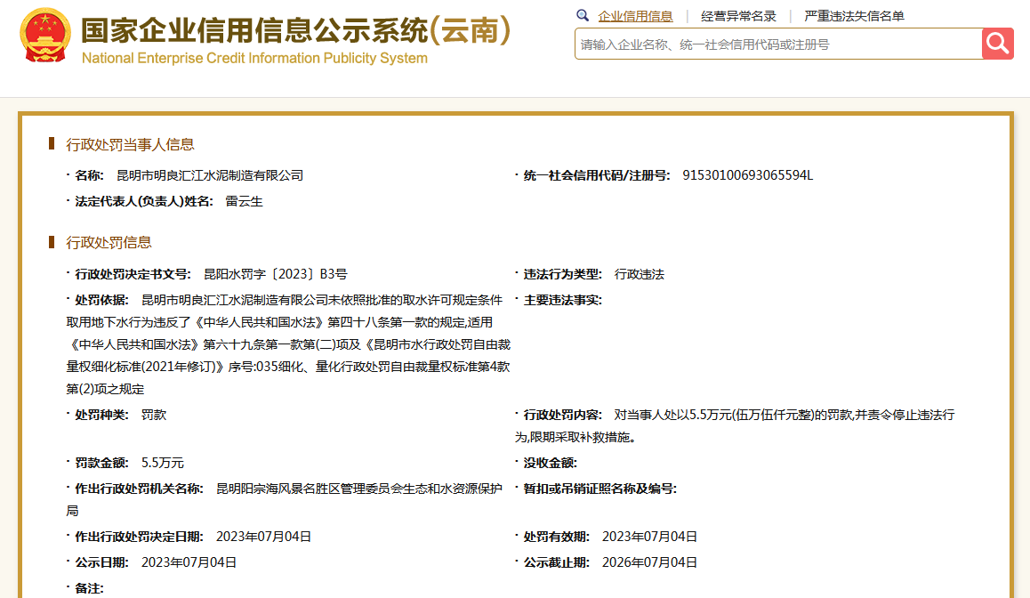 另外,根據(jù)國家企業(yè)信用信息公示系統(tǒng)公開信息顯示,昆明市明良匯江水泥制造有限公司未依照批準(zhǔn)的取水許可規(guī)定條件取用地下水,被昆明陽宗海風(fēng)景名勝區(qū)管理委員會(huì)生態(tài)和水資源保護(hù)局處罰。