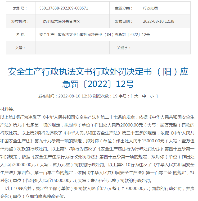 2022年8月10日,昆明陽宗海風(fēng)景名勝區(qū)管理委員會(huì)發(fā)布《安全生產(chǎn)行政執(zhí)法文書行政處罰決定書(陽)應(yīng)急罰〔2022〕12號》稱:昆明市明良匯江水泥制造有限公司大馬山石灰?guī)r礦在生產(chǎn)過程中存在未配備注冊安全工程師、采礦技術(shù)員,礦山+1980m水平臺(tái)階存在凹陷,該區(qū)域未設(shè)置警示標(biāo)識(shí),礦山未編制挖掘機(jī)、裝載機(jī)、推土機(jī)操作規(guī)程等違法違規(guī)行為,昆明陽宗海風(fēng)景名勝區(qū)管理委員會(huì)對該水泥廠作出7萬元處罰。
