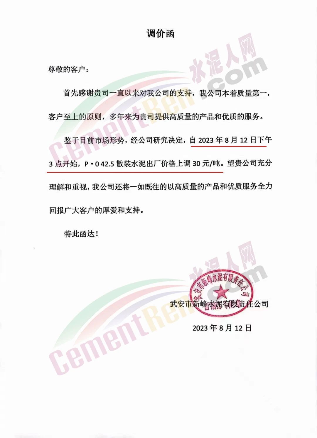 日前,武安市新峰水泥有限責(zé)任公司通知,鑒于目前市場(chǎng)形勢(shì),經(jīng)公司研究決定,自2023年8月12日下午3點(diǎn)開始,P.O42.5散裝水泥出廠價(jià)格上調(diào)30元/噸。