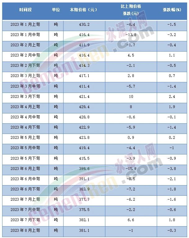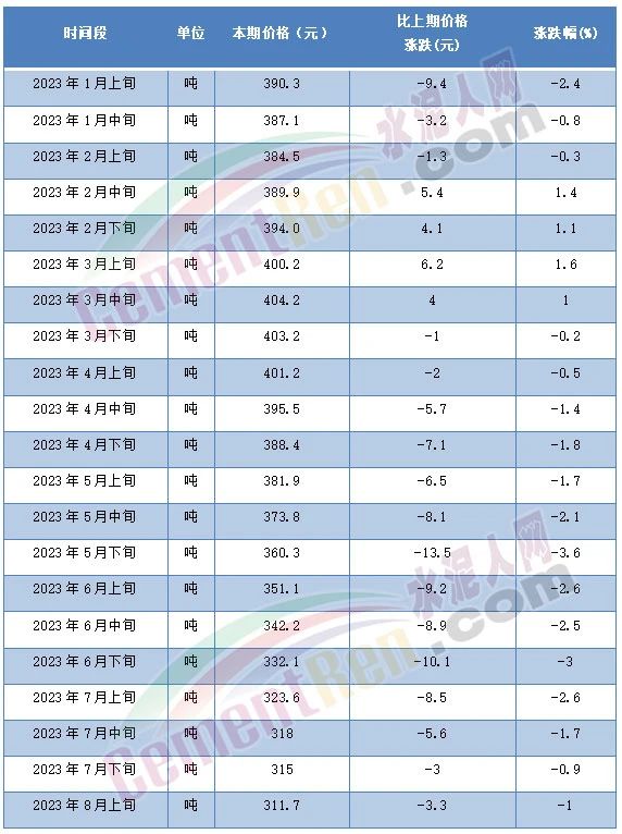 8月14日,國(guó)家統(tǒng)計(jì)局發(fā)布的2023年8月上旬流通領(lǐng)域重要生產(chǎn)資料市場(chǎng)價(jià)格變動(dòng)情況顯示,普通硅酸鹽水泥(P.O42.5散裝)水泥報(bào)價(jià)311.7元/噸,且為自5月上旬以來(lái)第10次突破年內(nèi)最低價(jià)。