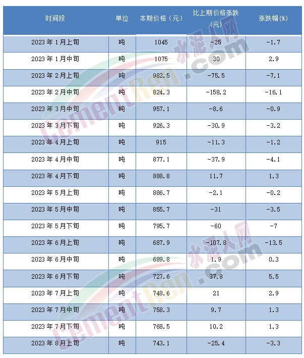煤炭?jī)r(jià)格方面,繼6月中旬開始回暖后至8月上旬再次下滑25.4元/噸。市場(chǎng)貿(mào)易商表示,立秋之后天氣轉(zhuǎn)涼,電廠用煤量下降。同時(shí)遇水泥、鋼鐵等市場(chǎng)淡季,貿(mào)易商囤貨意愿不強(qiáng),煤價(jià)失去支撐回落。以山西大混(5000大卡)為例,2023年6月中旬持續(xù)5期連漲后,至2023年8月上旬回落25.4元/噸至743.1元/噸。