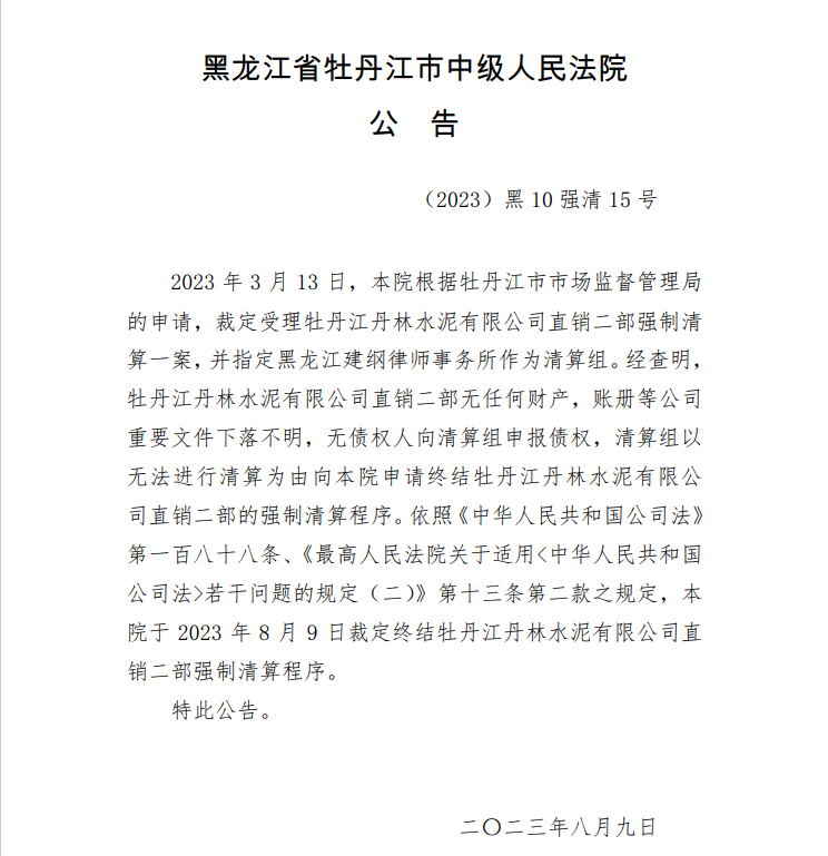 8月9日,黑龍江省牡丹江市中級人民法院公告,經(jīng)查明,牡丹江丹林水泥有限公司直銷二部無任何財產(chǎn),賬冊等公司重要文件下落不明,無債權(quán)人向清算組申報債權(quán),清算組以無法進行清算為由向本院申請終結(jié)牡丹江丹林水泥有限公司直銷二部的強制清算程序,本院裁定終結(jié)牡丹江丹林水泥有限公司直銷二部強制清算程序。