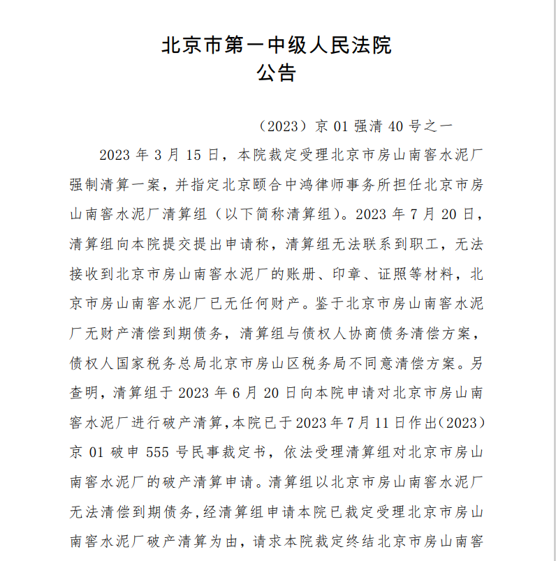 7月21日,北京市第一中級人民法院公告,本院于 2023 年7月21日確認(rèn)北京市房山南窖水泥廠清算報告并裁定終結(jié)北京市房山南窖水泥廠強制清算程序。