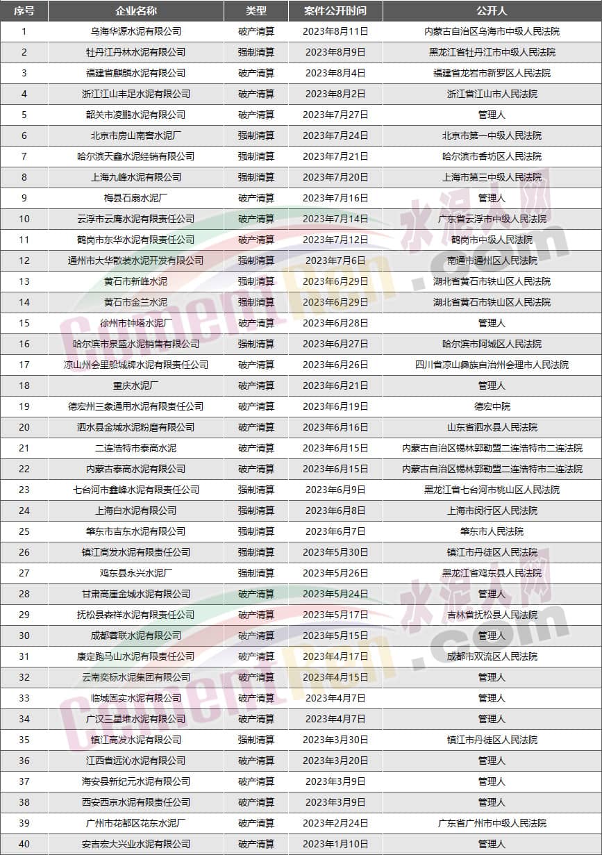 40家水泥企業(yè)宣布破產(chǎn)或進入破產(chǎn)程序