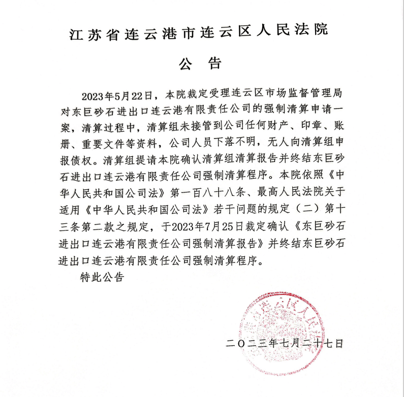 7月27日,江蘇省連云港市連云區(qū)人民法院公告,2023年5月22日,本院裁定受理連云區(qū)市場監(jiān)督管理局對東巨砂石進出口連云港有限責(zé)任公司的強制清算申請一案,清算過程中,清算組未接管到公司任何財產(chǎn)、印章、賬冊、重要文件等資料,公司人員下落不明,無人向清算組申報債權(quán)。清算組提請本院確認(rèn)清算組清算報告并終結(jié)東巨砂石進出口連云港有限責(zé)任公司強制清算程序。本院于2023年7月25日裁定確認(rèn)《東巨砂石進出口連云港有限責(zé)任公司強制清算報告》并終結(jié)東巨砂石進出口連云港有限責(zé)任公司強制清算程序。