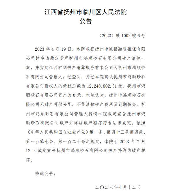7月12日,江西省撫州市臨川區(qū)人民法院公告,本院認(rèn)為,撫州市鴻順砂石有限公司無財產(chǎn)可供分配,不能清償破產(chǎn)費用及到期債務(wù)。撫州市鴻順砂石有限公司管理人提請本院裁定宣告撫州市鴻順砂石有限公司破產(chǎn)并終結(jié)破產(chǎn)程序符合法律規(guī)定。本院于2023年7月12日裁定宣告撫州市鴻順砂石有限公司破產(chǎn)并終結(jié)破產(chǎn)程序。